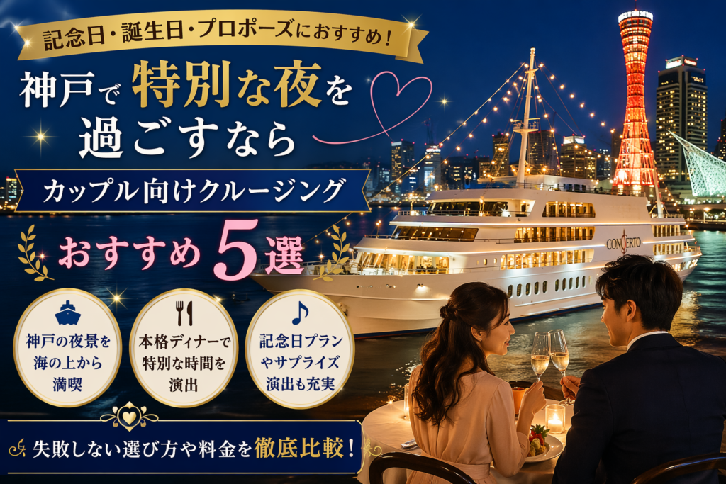 そこで本記事では、神戸で人気のクルージングを比較し、カップルや記念日デートに適したプランを厳選してご紹介します。サービス内容や口コミ、料金などを総合的に比較しているため、自分に合ったクルージングが見つかりやすくなっています。