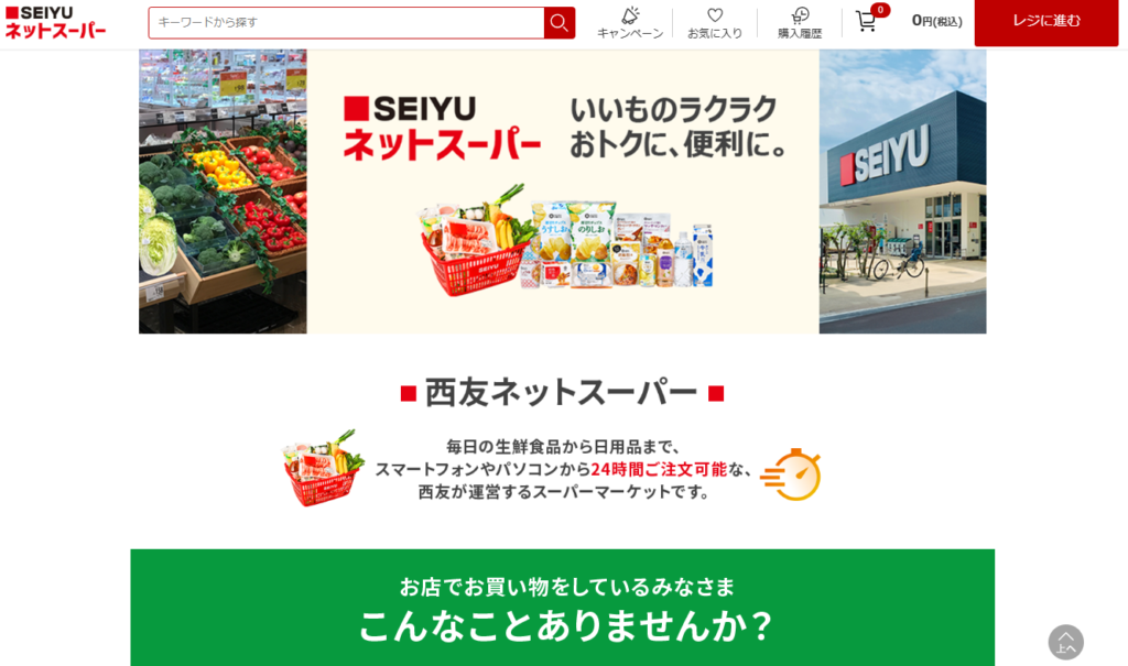 楽天ポイントが貯まる・使える点が最大の特徴。西友の低価格商品を中心に、コスパ志向の家庭に人気です。配送時間帯も比較的柔軟です。